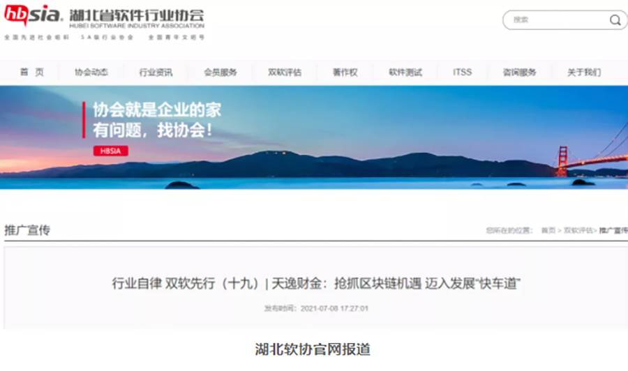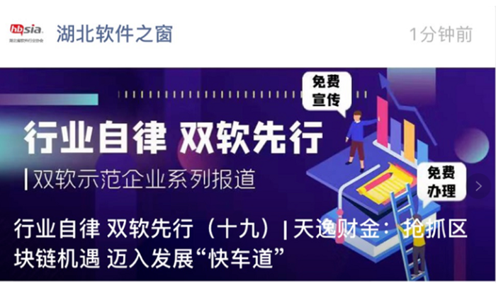 近期,湖北省軟件行業(yè)協(xié)會(huì)(以下簡(jiǎn)稱“湖北軟協(xié)”)開展“行業(yè)自律,雙軟先行”雙軟示范企業(yè)系列報(bào)道。7月8日,湖北軟協(xié)在其官方網(wǎng)站和微信公眾號(hào)同步報(bào)道《天逸財(cái)金:搶抓區(qū)塊鏈機(jī)遇 邁入發(fā)展“快車道”》。