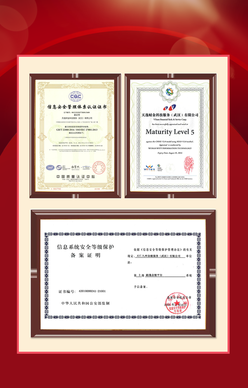2021年,天逸集團(tuán)榮獲ISO27001信息安全管理體系認(rèn)證、CMMI5全球最高等級(jí)認(rèn)證,彰顯集團(tuán)強(qiáng)大的科技創(chuàng)新能力。天逸集團(tuán)融逸金鏈平臺(tái)通過公安部“國家信息系統(tǒng)安全等級(jí)保護(hù)”三級(jí)備案與測(cè)評(píng),表明集團(tuán)信息安全水平已達(dá)到國內(nèi)非銀機(jī)構(gòu)最高標(biāo)準(zhǔn)。