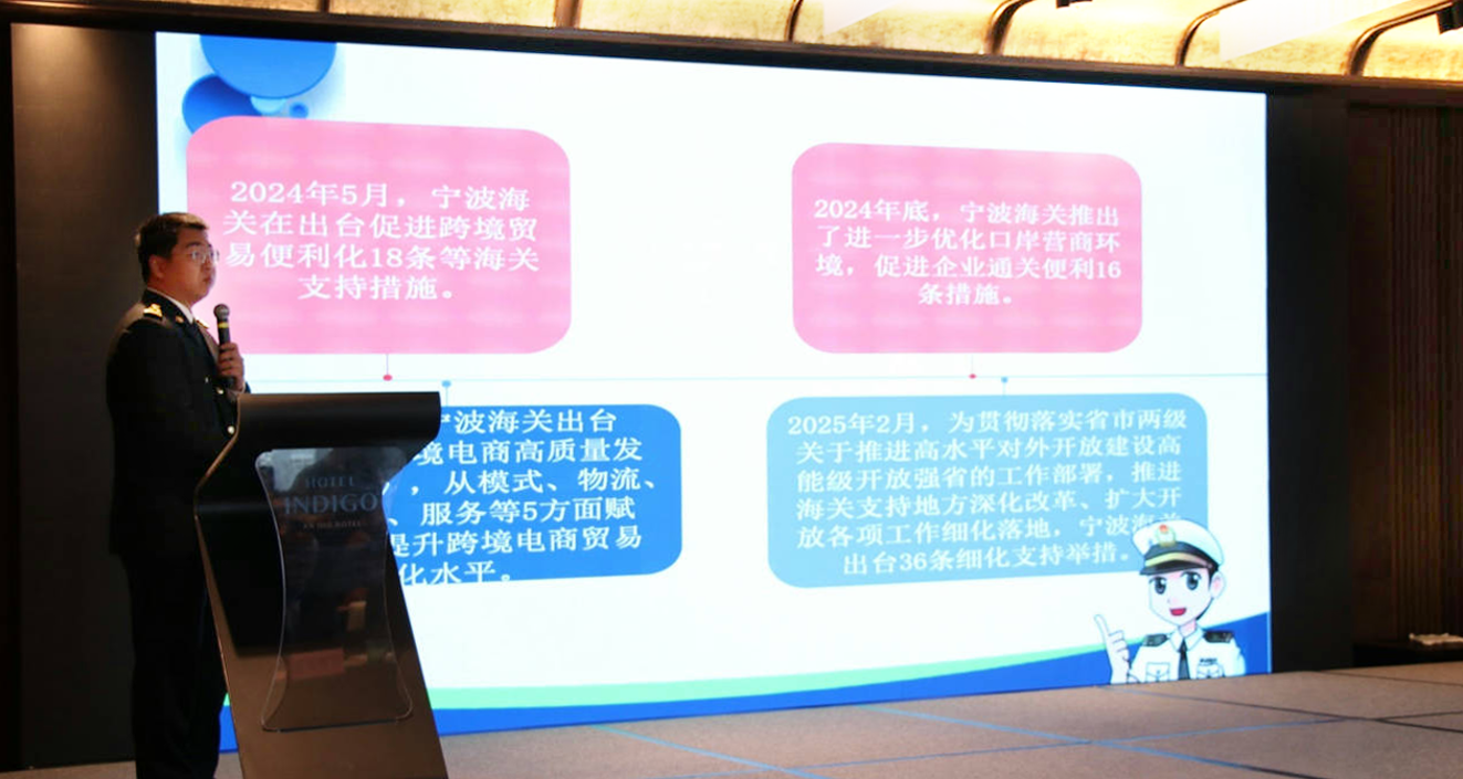 本場峰會(huì)圍繞政策解讀與實(shí)戰(zhàn)經(jīng)驗(yàn)分享展開,致力于構(gòu)建“政策輸血+金融活血”的賦能閉環(huán)。寧波市商務(wù)局跨境電商處一級主任科員王涼以《搶抓跨境電商新機(jī)遇,助力企業(yè)揚(yáng)帆出?!窞轭},結(jié)合前沿洞察,為參會(huì)企業(yè)深入剖析跨境電商領(lǐng)域的最新趨勢。甬江海關(guān)綜合業(yè)務(wù)二科副科長張琦夢從海關(guān)監(jiān)管與服務(wù)的角度出發(fā),圍繞《寧波海關(guān)36條工作舉措及惠企政策宣講》進(jìn)行詳細(xì)解讀,為企業(yè)提供政策指導(dǎo)與支持。