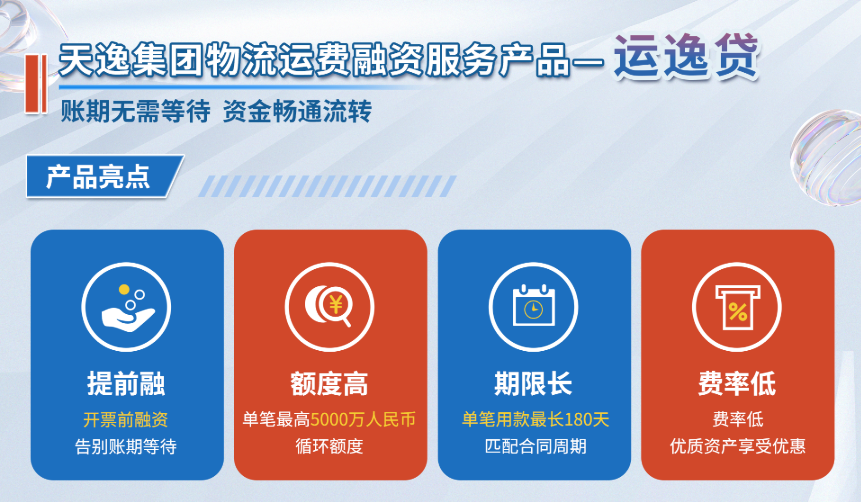 在物流行業(yè)競(jìng)爭(zhēng)日益激烈的今天,賬期長(zhǎng)、資金壓力大等資金周轉(zhuǎn)問(wèn)題一直是物流企業(yè)面臨的重大挑戰(zhàn)。天逸集團(tuán)作為物流企業(yè)融資的首選服務(wù)商,重磅推出物流運(yùn)費(fèi)融資服務(wù)產(chǎn)品——運(yùn)逸貸,為中大型物流公司的承運(yùn)商提供定制化的物流運(yùn)費(fèi)融資服務(wù)解決方案,解決物流企業(yè)賬期長(zhǎng)、資金壓力大的難點(diǎn)問(wèn)題。