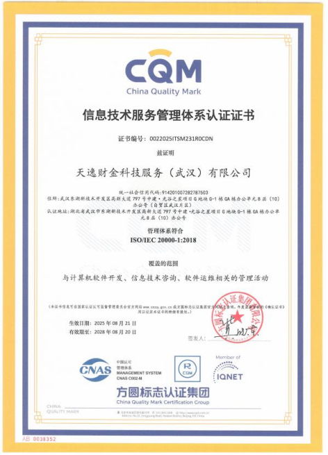 捷報!繼天逸集團(tuán)獲評工信部“國際先進(jìn)科技成果”國家級權(quán)威認(rèn)證后,集團(tuán)正式通過ISO20000信息技術(shù)服務(wù)管理體系認(rèn)證,并獲得國際認(rèn)證聯(lián)盟——IQNet Association頒發(fā)的ISO20000國際認(rèn)證證書,標(biāo)志著天逸集團(tuán)的IT服務(wù)管理能力已達(dá)到國際先進(jìn)水平。