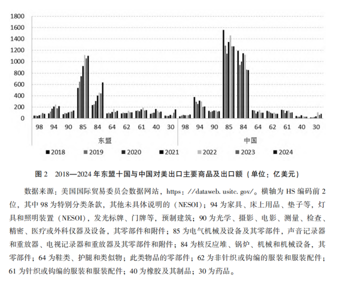 第一,替代者角色。出口結(jié)構(gòu)的替代與增長。隨著中國對美出口受高關(guān)稅政策影響而出現(xiàn)下滑,東盟國家在相關(guān)商品品類出口中出現(xiàn)顯著的結(jié)構(gòu)性替代現(xiàn)象。如圖1所示,2018年至2024年期間,中國對美出口年均降幅達3.2%(右軸),而同期東盟國家對美出口整體呈現(xiàn)穩(wěn)定增長趨勢(左軸)。尤其是越南、柬埔寨和老撾的增長率分別高達18.59%、22.51%和34.05%。進一步的商品結(jié)構(gòu)分析顯示(見圖2),東盟對美出口增量主要集中在家具、電子組件、服裝等傳統(tǒng)由中國主導(dǎo)的出口領(lǐng)域,其出口擴張并非源于整體競爭力提升,而是更多體現(xiàn)為“結(jié)構(gòu)性接替”中國所釋放的市場空間。東盟貿(mào)易增長深度嵌入于中美貿(mào)易沖突的結(jié)構(gòu)性轉(zhuǎn)移之中。