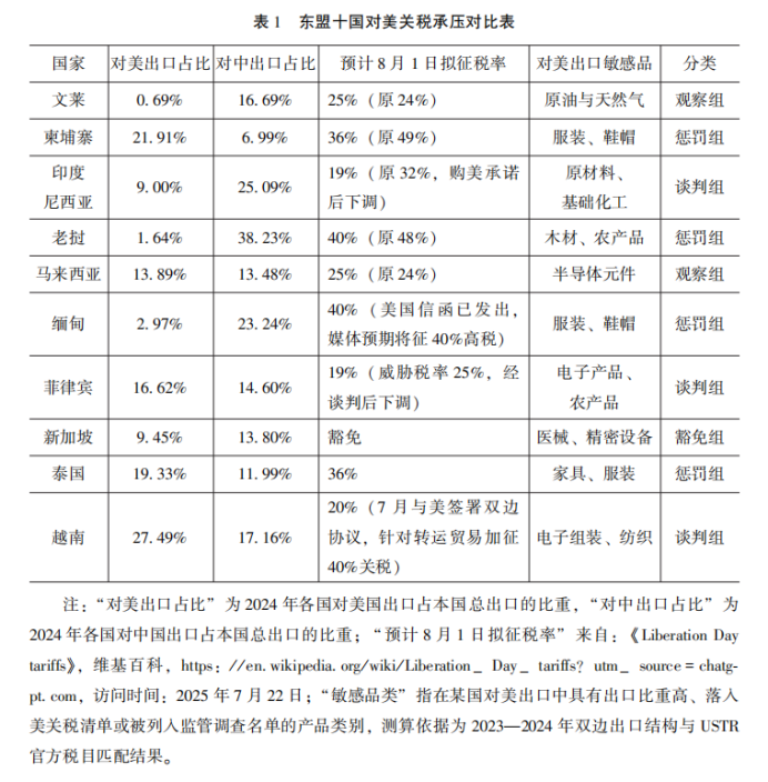 第二,承壓者角色。美方差別關(guān)稅政策的次級承壓區(qū)。東盟成為美國關(guān)稅政策差別施壓的主要目標區(qū)域之一。表1具體呈現(xiàn)了東盟十國面臨美方關(guān)稅施壓的差異化狀況。其中,柬埔寨、泰國、老撾與緬甸四國對美出口依賴度高、出口產(chǎn)品集中于敏感品類(如服裝、木材等),且在原產(chǎn)地監(jiān)管、制度透明度等方面存在短板,被列為高風(fēng)險“懲罰組”,擬征稅率超過36%。文萊和馬來西亞雖然在敏感產(chǎn)業(yè)上有所涉足,但具備與美談判潛力,暫未觸發(fā)系統(tǒng)性信任危機,擬稅率集中為25%。印度尼西亞、菲律賓和越南三國通過雙邊對話與采購承諾換取稅率下調(diào);例如越南在與美方簽署協(xié)議后,其電子與紡織品類稅率由原計劃的40%降至20%;印尼則在承諾擴大對美商品采購后,稅率自32%下調(diào)至19%。而新加坡因制度環(huán)境和技術(shù)能力突出,被列為“豁免組”。這種差別化施壓策略顯示,美國正試圖將貿(mào)易治理壓力制度化并轉(zhuǎn)嫁至區(qū)域?qū)用妗?/span>