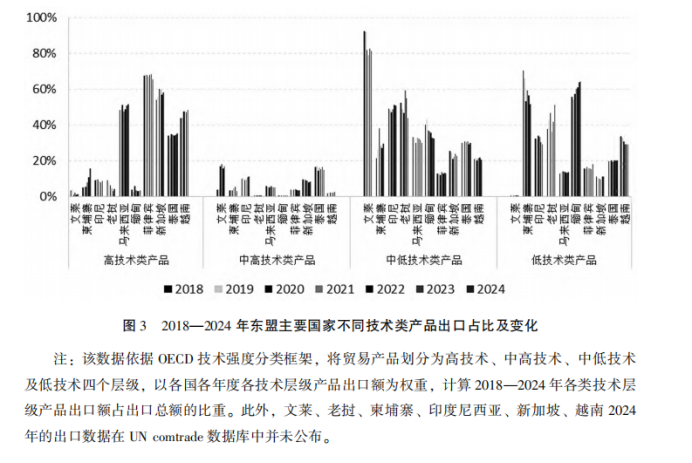 從技術(shù)密集度來看,東盟整體的出口結(jié)構(gòu)逐漸從勞動密集型產(chǎn)品向資本和技術(shù)密集型產(chǎn)品升級。依據(jù)OECD技術(shù)強度分類框架及ISICRev.4—HS2017映射標準,對2018年至2024年東盟國家出口產(chǎn)品的分析表明(見圖3),產(chǎn)品出口結(jié)構(gòu)變化具有異質(zhì)性。