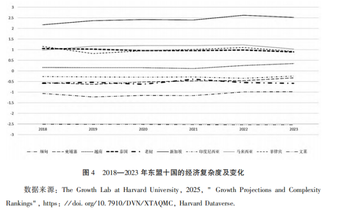 如圖4所示,2018年至2023年間東盟國家ECI值分化趨勢顯著。新加坡始終位居?xùn)|盟首位(2023年達2.52),體現(xiàn)其在高技術(shù)產(chǎn)品制造與服務(wù)嵌套方面具備高度復(fù)雜性與結(jié)構(gòu)穩(wěn)定性。馬來西亞、泰國、菲律賓和越南處于中等復(fù)雜度水平,其中越南ECI穩(wěn)步上升,從2018年的0.16增至2023年的0.35,顯示其產(chǎn)業(yè)多樣性和附加值能力正在提升。菲律賓和泰國則出現(xiàn)一定波動,表明其制造升級仍受內(nèi)外部約束。相比之下,印度尼西亞、老撾、緬甸、柬埔寨與文萊的ECI值整體偏低,2023年分別為-0.24、-0.58、-0.98、-0.33和-2.5,反映出其出口結(jié)構(gòu)依然集中于初級產(chǎn)品或低端加工,缺乏技術(shù)擴散與產(chǎn)業(yè)延展能力。總之,東盟國家對外貿(mào)易結(jié)構(gòu)正在由低附加值品類向高附加值領(lǐng)域拓展,但國家間升級路徑顯著分化。部分國家(如新加坡、馬來西亞)已基本實現(xiàn)向“創(chuàng)新導(dǎo)向”轉(zhuǎn)型,另一些國家仍處于“成本比較優(yōu)勢”主導(dǎo)的階段。在全球供應(yīng)鏈持續(xù)重組背景下,出口結(jié)構(gòu)與產(chǎn)業(yè)功能的協(xié)同演進,將成為決定東盟各國未來價值鏈地位與增長韌性的關(guān)鍵因素。