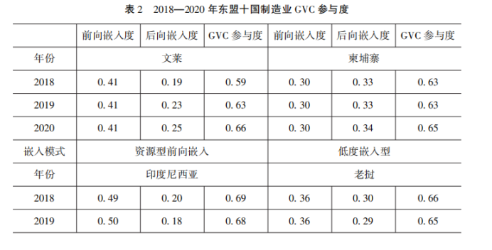 除經(jīng)濟復(fù)雜度外,出口結(jié)構(gòu)的升級更深層地體現(xiàn)在全球價值鏈(GVC)中的嵌入模式變化。具體而言,不同國家在GVC中的參與層級決定了其附加值獲取能力與抗風(fēng)險能力。為精確量化各國的全球價值鏈參與情況,本文參考Koop-man等(2010)提出的GVC參與指數(shù)計算方法,得到東盟國家制造業(yè)的前向嵌入度、后向嵌入度和GVC參與度。GVC參與指數(shù)從整體上衡量了一國某產(chǎn)業(yè)參與全球價值鏈的深度和分工地位,前向嵌入度越大表明一國某產(chǎn)業(yè)處于國際分工地位越高,在技術(shù)或資源上具有上游優(yōu)勢;后向嵌入度越高表明該國該產(chǎn)業(yè)越依賴進口中間品,以加工組裝為主。因數(shù)據(jù)可得性,本文測算了2018年至2020年東盟各國制造業(yè)的GVC參與度,詳見表2。數(shù)據(jù)來源于OECD的TIVA數(shù)據(jù)庫,其中制造業(yè)行業(yè)的選取參考王慶年等(2023)學(xué)者的研究,在TIVA的45個行業(yè)中選取17個制造行業(yè)。