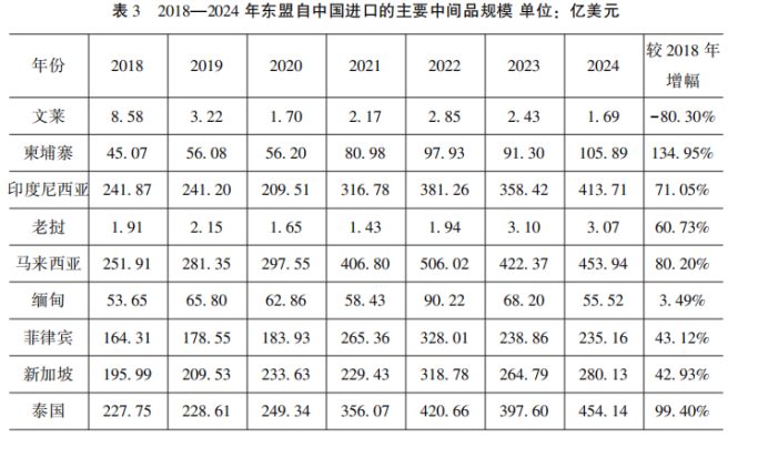 從國別結(jié)構(gòu)來看,近年來東盟主要經(jīng)濟體自中國進口中間品的規(guī)模顯著增長,呈現(xiàn)出產(chǎn)業(yè)耦合加深、功能分工明晰的趨勢。2024年,越南自中國進口的中間品總額達到1088.30億美元,較2018年的539.66億美元增長超過102%,表明其制造業(yè)擴張與對美出口增長過程中,中國中間品在關(guān)鍵工序上的功能性嵌入不斷深化。特別是在電子組裝與機電產(chǎn)品等高附加值行業(yè),中國提供的電路板、顯示模組、電機元件等核心部件已成為越南出口成品的重要技術(shù)基礎(chǔ)。馬來西亞表現(xiàn)出類似趨勢。2024年從中國進口中間品總額為453.94億美元,其中硅晶片、封裝材料和自動化設(shè)備等構(gòu)成其半導(dǎo)體產(chǎn)業(yè)鏈上游的關(guān)鍵投入,占比超過60%。已有研究指出,馬來西亞對美出口終端產(chǎn)品中,約三分之二可溯源至中國產(chǎn)零部件,說明中馬在高技術(shù)制造業(yè)中已建立起穩(wěn)定的垂直分工路徑(Zhang & Li,2025)。菲律賓和印度尼西亞亦顯示出中間品進口的持續(xù)擴張。2024年,菲律賓中間品進口額達235.16億美元,較2018年增長43.12%;印度尼西亞同期從241.87億美元增至413.71億美元,增長71.05%。二者在電子組件、機械設(shè)備等領(lǐng)域的加工與裝配能力提升顯著,而這一過程顯然建立在對中國高技術(shù)中間品持續(xù)獲取的基礎(chǔ)上,體現(xiàn)出區(qū)域內(nèi)功能互補型產(chǎn)業(yè)協(xié)作的深化。柬埔寨雖仍以輕工制品出口為主,但其中間品進口年均增長超過15%,2024年總額達105.89億美元,較2018年增長134.95%。這表明其正由傳統(tǒng)勞動密集型加工模式,逐步向組裝導(dǎo)向的制造業(yè)過渡,體現(xiàn)出價值鏈上移的初步特征。新加坡則作為東南亞高附加值制造與服務(wù)樞紐,2024年從中國進口中間品280.13億美元,主要集中于ICT設(shè)備、醫(yī)療器械與精密零部件,展示出其在區(qū)域價值鏈中的技術(shù)節(jié)點地位。