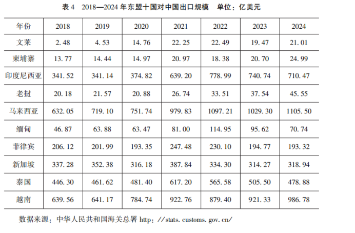 綜上可見,現(xiàn)有研究從多維角度揭示了中美戰(zhàn)略競爭背景下東盟貿(mào)易結(jié)構(gòu)的變動路徑,為理解大國博弈對區(qū)域經(jīng)濟體影響提供了重要參考。然而,隨著大國博弈日趨復(fù)雜,貿(mào)易替代的可持續(xù)性與產(chǎn)業(yè)鏈本地化嵌入等問題逐漸凸顯,東盟國家面臨的結(jié)構(gòu)調(diào)整任務(wù)也更加多樣。特別是在中間品環(huán)節(jié)的動態(tài)演化、東盟內(nèi)部結(jié)構(gòu)差異與應(yīng)對策略等方面,仍有深化空間?;诖?本文在吸收既有成果的基礎(chǔ)上,聚焦中美關(guān)稅博弈下2018年至2024年東盟國家貿(mào)易規(guī)模及結(jié)構(gòu)變化,研究東盟國家在全球價值鏈位置的演變趨勢及其產(chǎn)業(yè)升級路徑,呈現(xiàn)東盟在大國競爭格局下角色調(diào)整,為區(qū)域經(jīng)濟體應(yīng)對復(fù)雜外部環(huán)境提供理論依據(jù)和實踐指導(dǎo)。