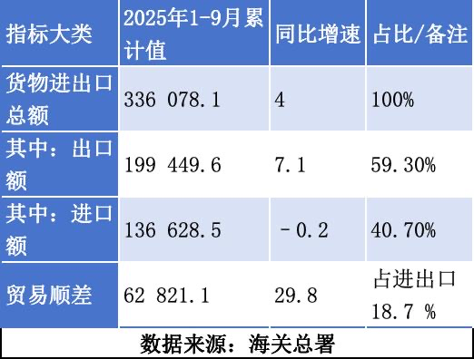 據(jù)海關(guān)總署統(tǒng)計,2025年1—9月,全國進出口總額為336078.1億元人民幣,同比增長4.0%。其中,出口額為199449.59億元,同比增長7.1%;進口額為136628.52億元,同比下滑0.2%;貿(mào)易順差62821.07億元,同比擴大約30%。