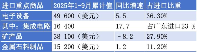 2025年1—9月,廣東進出口7.02萬億元,增長3.8%,占全國20.9%,其中出口4.48萬億元,增長1.4%,進口2.54萬億元,增長8.2%。