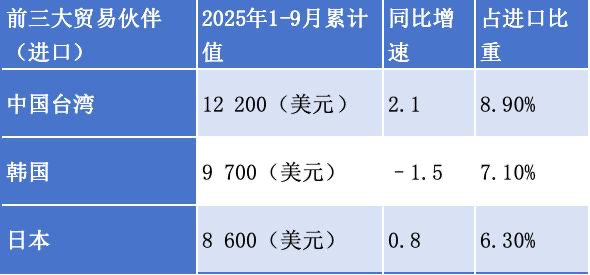 其中德國、荷蘭、法國為前三大歐盟內(nèi)市場。進口方面,中國臺灣、韓國、日本為前三大來源地,分別進口1693億美元、1348億美元、1194億美元,合計占進口總值的37.8%,反映國內(nèi)電子制造對東亞供應(yīng)鏈的高度依賴。