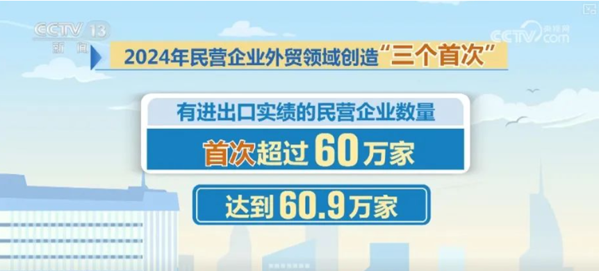 縱觀2024年,民營(yíng)、外資、國(guó)有企業(yè)三大類外貿(mào)經(jīng)營(yíng)主體活躍度不斷提升,全年有進(jìn)出口實(shí)績(jī)的企業(yè)近70萬家,數(shù)量再創(chuàng)新高。