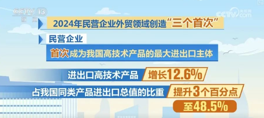 第二個(gè)首次,是民營(yíng)企業(yè)首次成為中國(guó)高技術(shù)產(chǎn)品的最大進(jìn)出口主體,進(jìn)出口高技術(shù)產(chǎn)品增長(zhǎng)12.6%,占中國(guó)同類產(chǎn)品進(jìn)出口總值的比重提升3個(gè)百分點(diǎn)至48.5%。