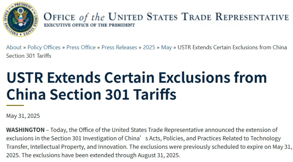 當(dāng)?shù)貢r(shí)間5月31日,美國貿(mào)易代表辦公室發(fā)佈消息,將針對(duì)中國在技術(shù)轉(zhuǎn)讓、智慧財(cái)產(chǎn)權(quán)及創(chuàng)新領(lǐng)域相關(guān)行為、政策與做法開展的301條款調(diào)查中,部分產(chǎn)品的關(guān)稅豁免期限進(jìn)行延長。原定於2025年5月31日到期的豁免,現(xiàn)延長至2025年8月31日 。