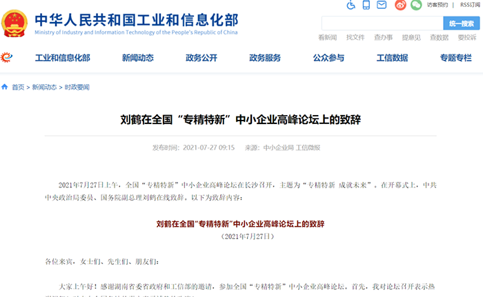 2021年7月27日上午,全國(guó)“專精特新”中小企業(yè)高峰論壇在長(zhǎng)沙召開,主題為“專精特新 成就未來(lái)”。在開幕式上,中共中央政治局委員、國(guó)務(wù)院副總理劉鶴在線致辭。